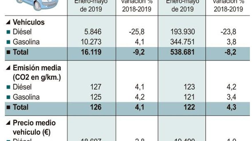 La matriculación de turismos y todoterrenos diésel durante los cinco primeros meses del año disminuyeron un 25,75 por ciento en Castilla y León. Esta caída supuso 2.028 unidades respecto a los mismos datos de 2018, cuando los vehículos de gasóleo recién salidos de los concesionarios en la Comunidad se contabilizó en 7.874 unidades. Pese al descenso en el registro de este tipo de vehículos, las emisiones medias aumentaron. A fecha de mayo de 2019, los motores de gasóleo produjeron 127 gramos de dióxido de carbono por kilómetro, frente a los 122 del año pasado.