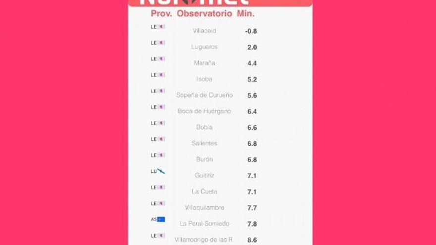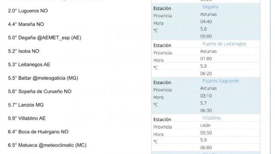 Dentro del top ten de lugares más fríos de España en las últimas 24 horas al caso de San Isidro se suman la localidad lacianega de Villablino, con 5,4 grados, Cubillas de Rueda, con 7,3, y Vega de Espinareda, con 7,7 grados. El resto de puntos se observaron en las comunidades autónomas de Asturias y Cantabria.
