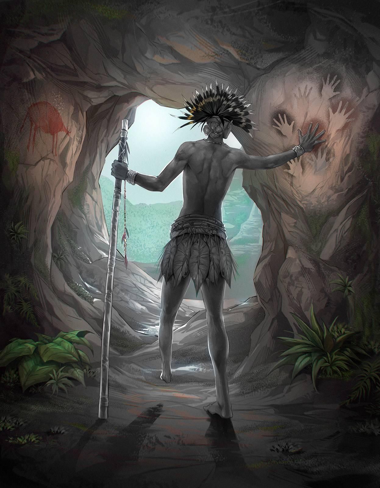 Recreación artística del individuo a quien se le amputó una pierna hace 31.000 años en una cueva de Borneo. / José García (Garciartist) y Griffith University.