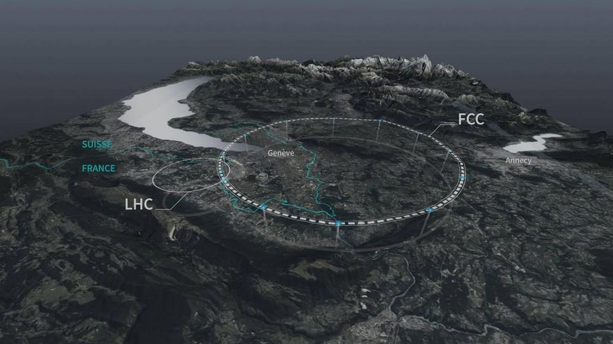 Junto al actual Gran Colisionador de Hadrones (LHC), un anillo de 27 km, está previsto construir un acelerador de partículas mucho mayor: el Futuro Colisionador Circular (FCC), de 100 kilómetros. // CERN