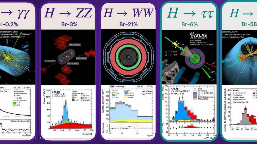 Bosón de Higgs (H) desintegrándose en distintos modos: dos fotones, dos bosones Z, dos bosones W, dos taus y dos quarks botón. El Br es el branching ratio, el porcentaje de probabilidad en el que el H se desintegrará en dicho canal. // CMS y ATLAS (CERN)