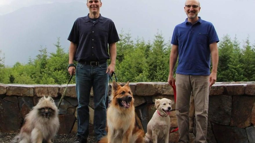 Los cofundadores de Dog Aging Project el biogerentólogo Matt Kaeberlein y el genetista Daniel Promislow con sus mascotas Chloe, Dobby y Frisbee. / Universidad Texas A&M