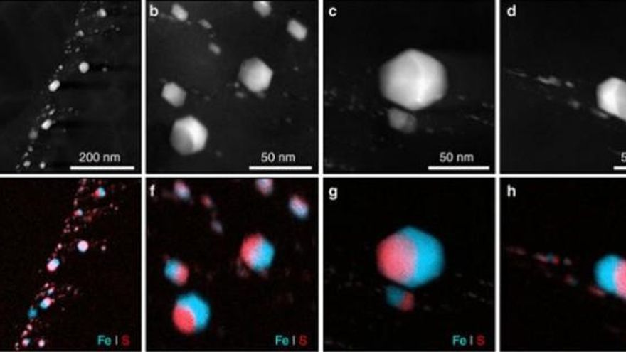 Microfotografía electrónica y mapas de composición de las incrustaciones de diamante en la ureilita, donde se muestra el hierro (Fe) en azul y el azufre (S) en rojo. / Farhang Nabiei et al./Nature Communications