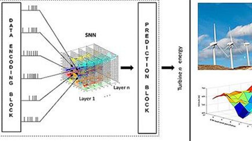 La investigación presenta una arquitectura basada en 'spiking neural networks' (SNN, o redes neuronales de tercera generación) para predecir la cantidad de energía que será generada por una turbina eólica, situada en el interior de un parque eólico, en la próxima hora, considerando el comportamiento del viento (intensidad y dirección) en las horas anteriores.