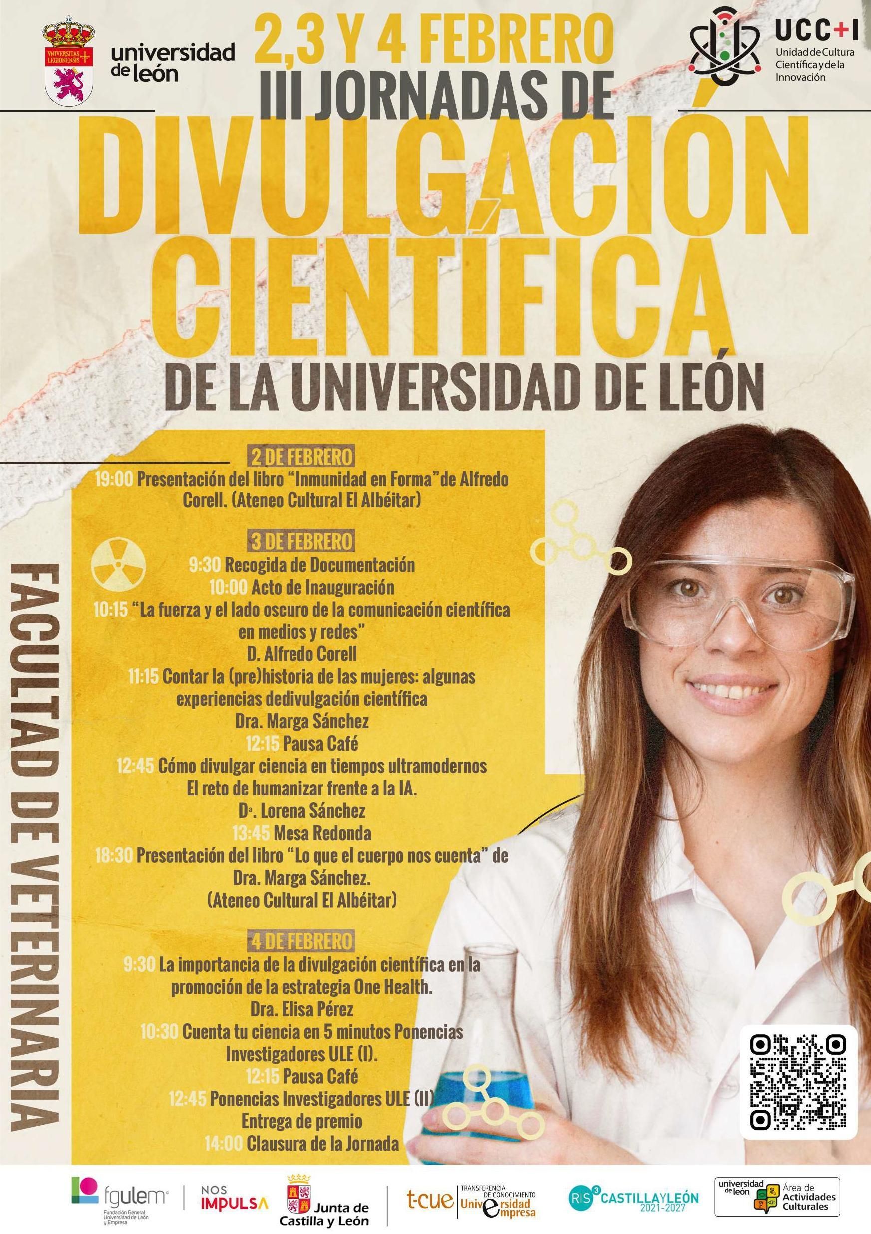La jornada, organizada por la Unidad de Cultura Científica y de la Innovación (UCC+i) de la ULE, en colaboración con la Fundación General de la Universidad y de la Empresa (FGULEM), vuelve a convertir la Facultad de Veterinaria en el epicentro de la divulgación científica, con un programa que combina ponencias de alto nivel, debate y participación del personal investigador.