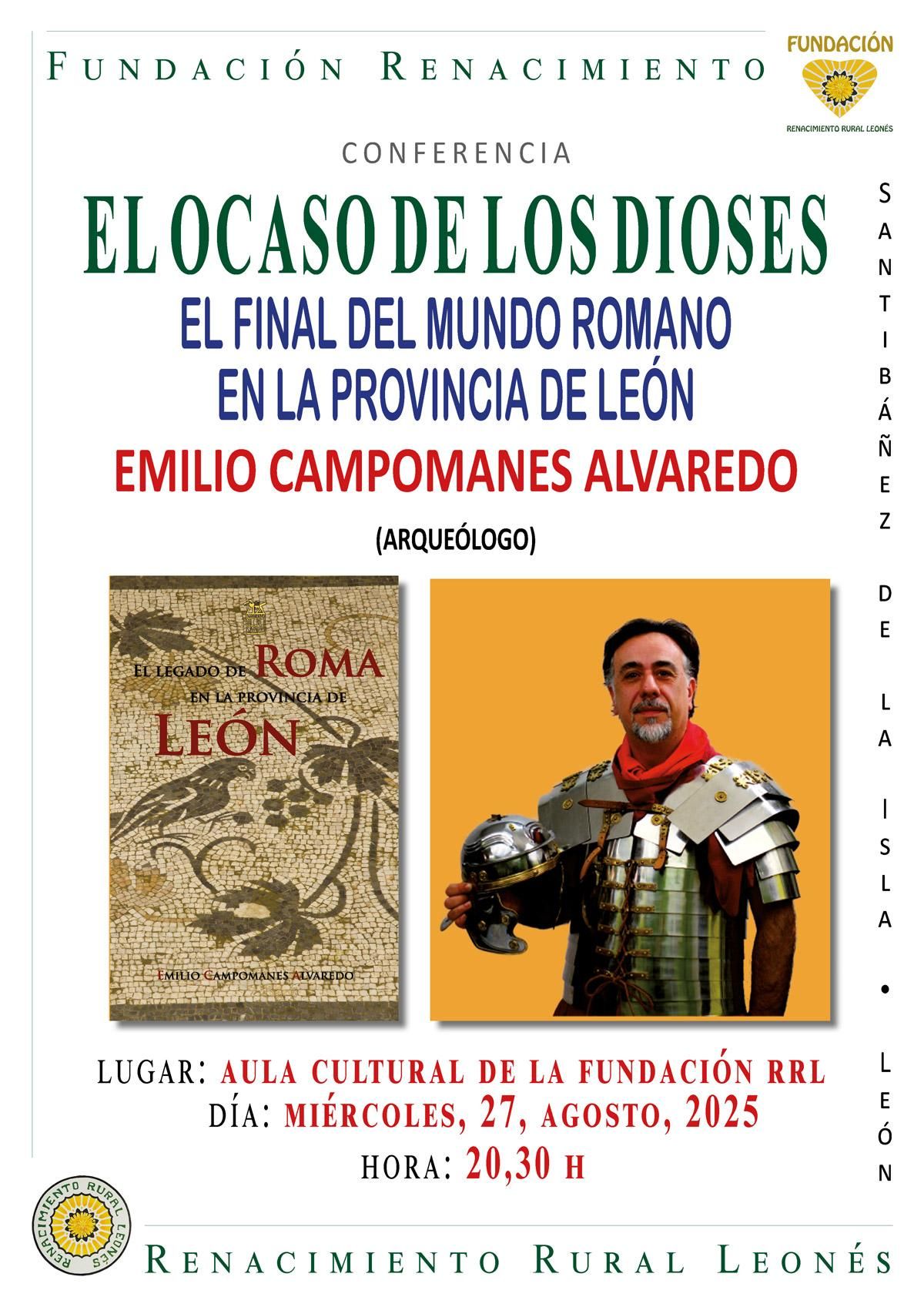 La Fundación Renacimiento acogerá el Miércoles, 27 de agosto, una de las citas culturales más esperadas del verano en León. Se trata de la conferencia 'El ocaso de los dioses',el final del mundo romano en la provincia de León, que será impartida por Emilio Campomanes Alvaredo, reconocido arqueólogo especializado en el legado romano en la Península Ibérica. El acto tendrá lugar en el Aula Cultural de la Fundación Renacimiento Rural a partir de las 20.30 horas.