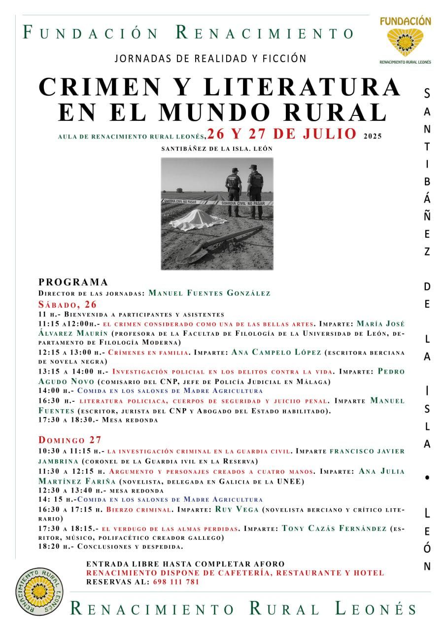 El Aula de Renacimiento Rural Leonés en Santibáñez de la Isla acoge los días sábado, 26 y domingo, 27 de julio de 2025 las jornadas Crimen y literatura en el mundo rural, un encuentro que reflexiona sobre la intersección entre realidad y ficción criminal en el ámbito rural. Organizadas por la Fundación Renacimiento y dirigidas por el jurista Manuel Fuentes González, estas jornadas reúnen a expertos en investigación policial y destacados escritores del género negro y criminal.