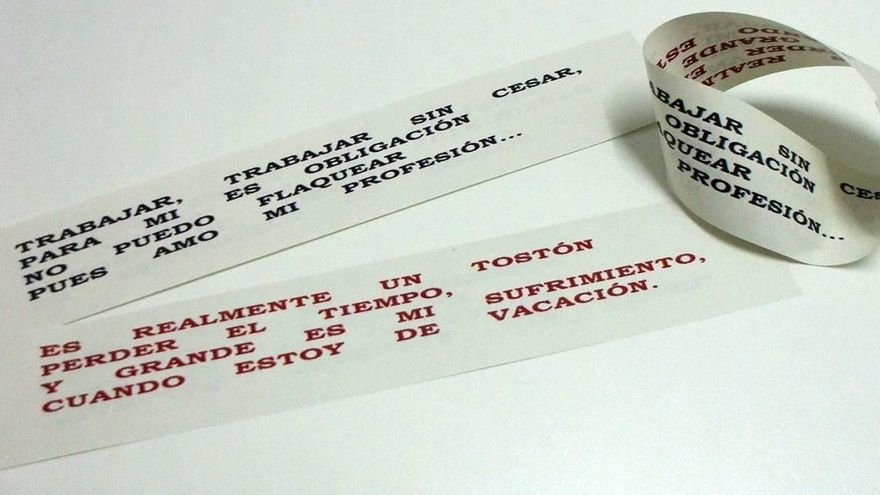 Después se pega la tira para formar una banda de Möbius, y el poema, inicialmente escrito sobre dos caras, aparece ahora solo en una, cambiando totalmente el sentido de la poesía. Lo que era una alabanza al esfuerzo y al trabajo se convierte en un elogio a la holgazanería: