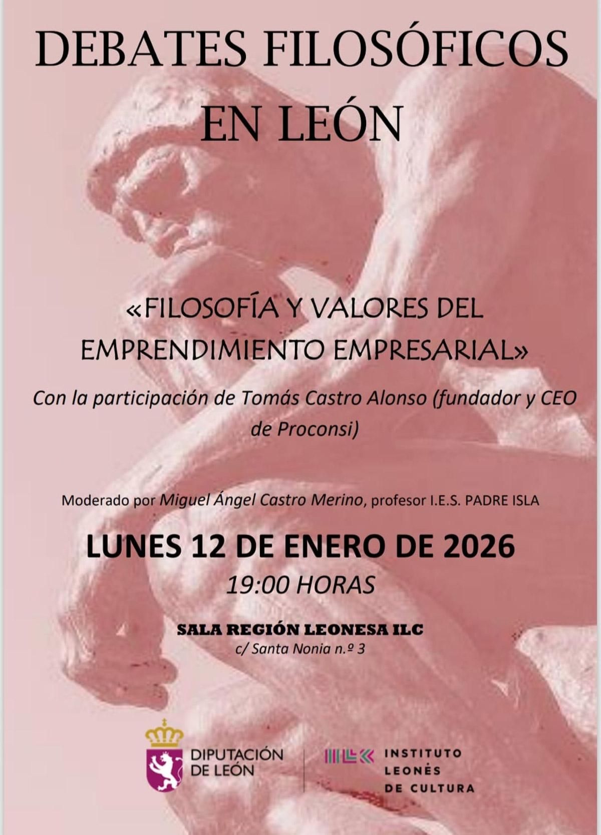 El ILC acogerá este 12 de enero una nueva edición de los Debates Filosóficos en León. Bajo el título Filosofía y valores del emprendimiento empresarial, el encuentro contará con la participación destacada de Tomás Castro Alonso, fundador y CEO de la empresa tecnológica Proconsi, quien aportará su visión sobre la ética en el mundo de los negocios.