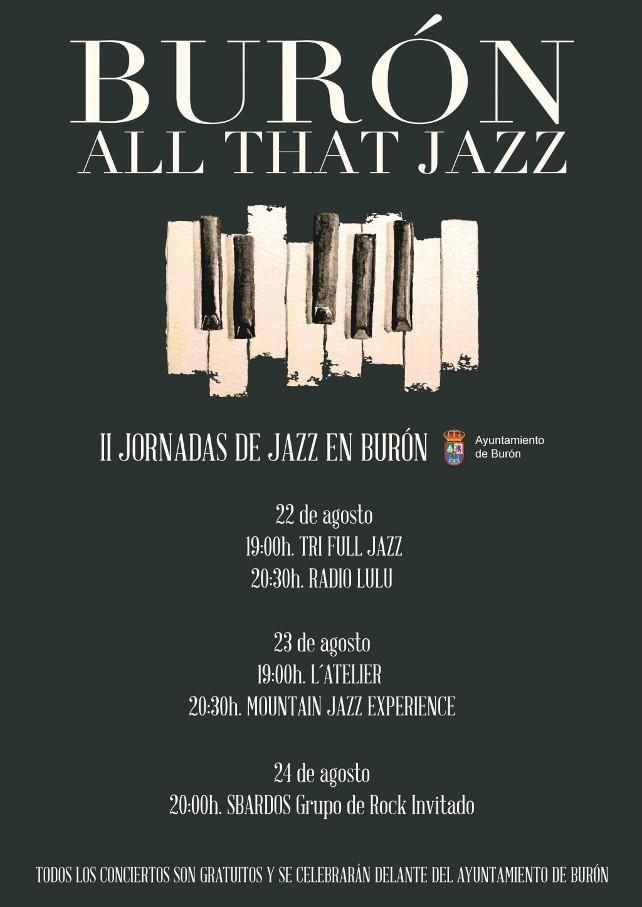 La localidad de Burón, a pocos kilómetros de Riaño, vuelve a apostar por el jazz con las II Jornadas All That Jazz. Los conciertos, que comienzan todos los días a las 19.00 se celebrarán delante del ayuntamiento de Burón y son totalmente gratuitos.
