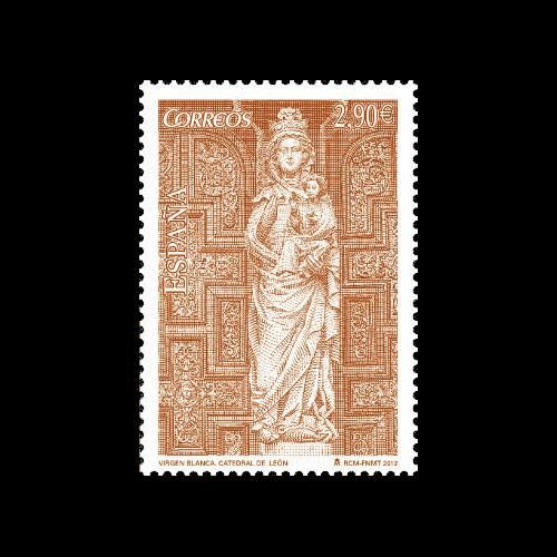 Sello dedicado a la imagenm de la Virgen Blanca, que preside la portada Oeste de la catedral de León