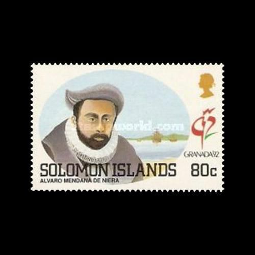 Sello de las Islas Salomón, editado para la expo filatélica de Granada de 1992, nos muestra nuevamente al descubridor de aquellas lejanas tierras, Álvaro de Mendaña y Neira.