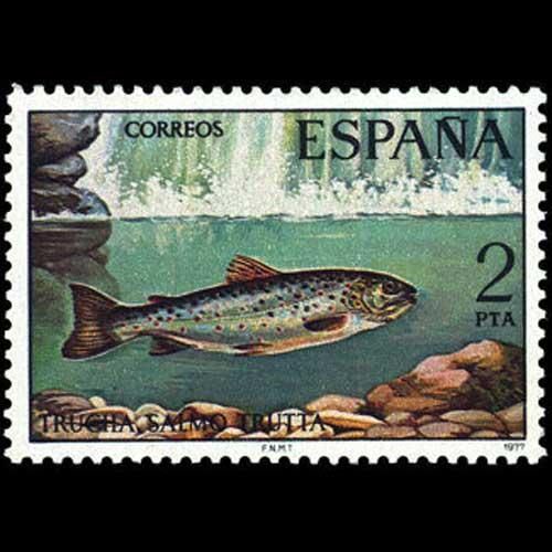 La reina de nuestros ríos, la trucha, en un sello emitido en otra serie dedicada a la fauna española. Por supuesto que nos referimos a las pintonas, las Salmo trutta morfo fario - trucha común - que ni son especie invasiva ni nada que se le parezca. Recordaremos aquí que hace breves fechas tanto el río Bernesga como el Torío han sido declarados ríos trucheros a su paso por la capital leonesa.