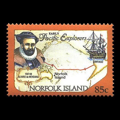 Sello del territorio de Norfolk Island (Australia) dedicado a uno de los viajes, nuevamente, de Álvaro de Mandaña por el Pacífico en el siglo XVII