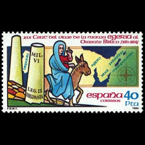 Egeria se supone que era originaria de Gallaecia en la provincia romana de Hispania,e incluso algún autor ha propuesto la posibilidad de que pudiera pertenecer a la comarca de El Bierzo, en la Gallaecia interior. El sello fue emitido para conmemorar los 1600 años de su peregrinación Tierra Santa.