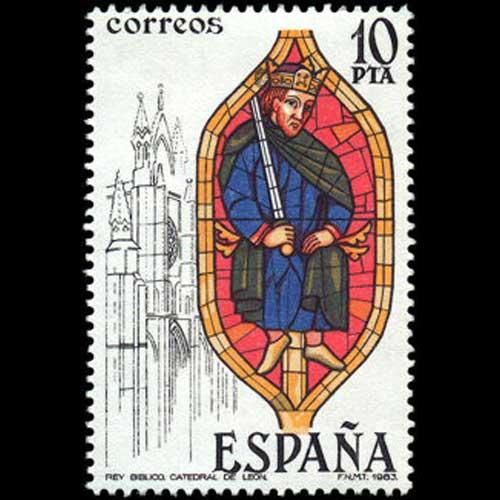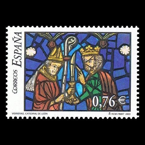 Sello emitido en el año 2003 para conmemorar el VII centenario de la Catedral de Santa María de León. La escena muestra al rey Recesvinto en el momento de, según cuenta la tradición ofrecer un puñal a san Ildefonso para obtener una reliquia del manto de Santa Leocadia.