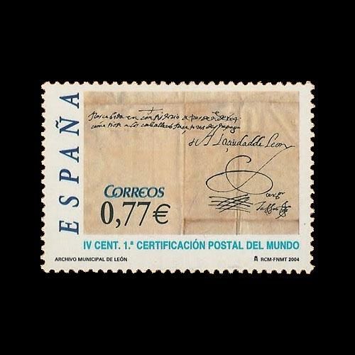 El sello representa un documento guardado en el Archivo Provincial de León que es considerado la primera carta certificada enviada en el mundo. El documento provenía de Valladolid y tenía por destino León.