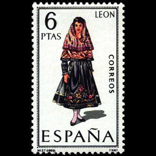 De una serie complementaria de la anterior y que muestra trajes regionales femeninos de cada una de las provincias de España, este sello que muestra una leonesa ataviada con el traje típico.