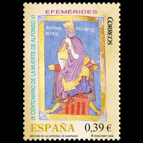 Alfonso VI de León, conocido como Alfonso el Bravo, fue también rey de Castilla y de Galicia. Hijo de Fernando I y de Sancha de León, a la muerte de ésta hubo de enfrentarse con los deseos expansionistas de su hermano Sancho, quien perdió su vida en el cerco de Zamora. Muerto Sancho y encarcelado su hermano García en el castillo de Luna, Alfonso se consolida en el trono leonés y se anexiona los territorios de Álava, Vizcaya, Guipúzcoa y La Bureba, adoptando en 1077 el título de Emperador. Recuperó Toledo en 1085 y falleció en esa misma ciudad en 1109. Fue enterrado, conforme a sus deseos, en el monasterio de Sahagún.