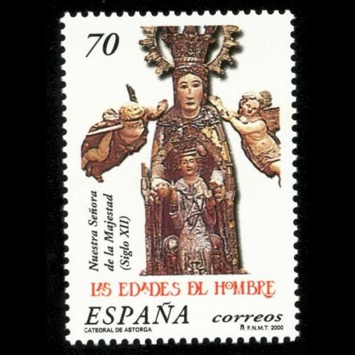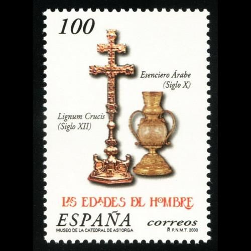 Dos sellos conmemorativos de la celebración de la Exposición 'Las Edades del Hombre' en la ciudad de Astorga. Uno de ellos representa una talla de Nuestra Señora de la Majestad, datada en el siglo XII, y el segundo muestra una imagen de un Lignum Crucis del siglo XII y un esenciero árabe del siglo X.