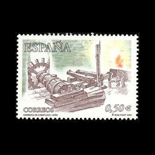 Sello dedicado a este ejemplo de industria medieval popular. La instalación aprovecha la energía hidráulica para realizar las actividades de la forja.