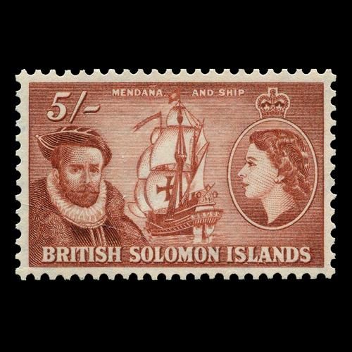 Sello emitido por las Islas Salomón, cuando eran las Islas Salomón Británicas y que muestra a Álvaro de Mendaña, descubridor de aquellas islas en 1567, y una de sus naves junto a la efigie de la reina Isabell II de Inglaterra.