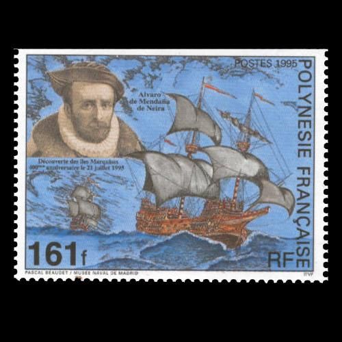 Sello emitido por la polinesia Francesa en conmemoración del 400 aniversario del descubrimiento de las Islas Marquesas por Álvaro de Mendaña y Pedro Fernández de Quirós en 1595. Es una serie de dos sellos. Éste es el que retrata al berciano de Congosto.
