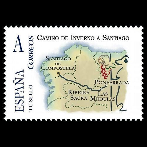 Sello conmemorativo del Camino de Invierno a Santiago de Compostela. El Camino de Invierno une Ponferrada con Santiago por el valle del río Sil evitando las cumbres del Cebreiro, y, por tanto, es más asequible en invierno, como bien sabían los peregrinos medievales.