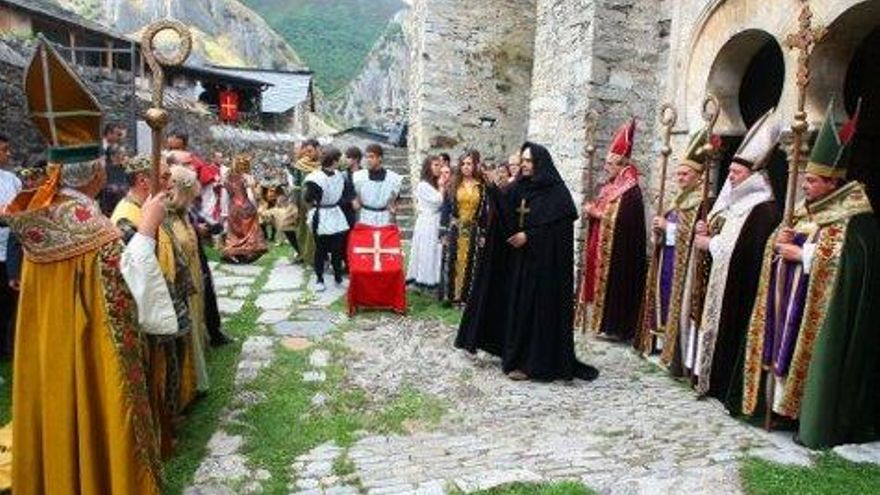 César Sánchez/ICAL. La asociación de vecinos ‘Valle del Silencio’ recrea la entrega de la Cruz de Peñalba del rey Ramiro II a la comunidad monástica del pueblo de Santiago de Peñalba en el siglo X