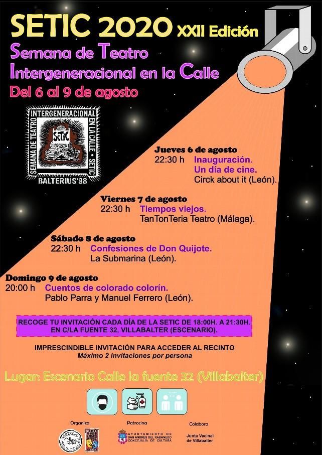 Como cada año, Balterius'98 lleva a cabo la SETIC (Semana de Teatro Intergeneracional en la Calle) que se desarrolla al aire libre en la localidad de Villabalter. En esta ocasión ha sido necesario elaborar un protocolo de seguridad para dar respuesta a la realidad sanitaria del coronavirus y a su vez poder seguir ofreciendo esta emblemática semana de teatro, esta edición con un total de cuatro representaciones que darán comienzo el jueves 6 de agosto y terminarán el domingo 9.