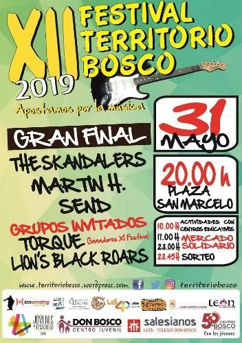 Durante todo el día y dentro de una jornada festiva y solidaria, tendrá lugar la Gran Final de la duodécima edición del Festival Territorio Bosco, el próximo viernes 31 de mayo, en la céntrica Plaza de San Marcelo de León. A partir de las 20.00 horas llegarán las actuaciones de los grupos finalistas al evento. Los escogidos por el jurado han sido: The Skandalers, Martín H. y Send.