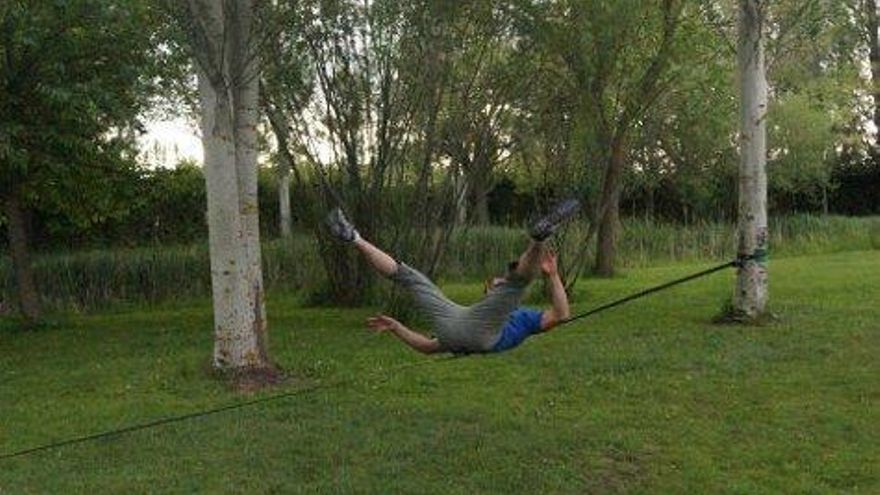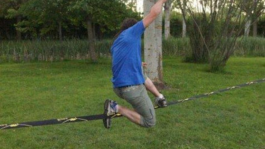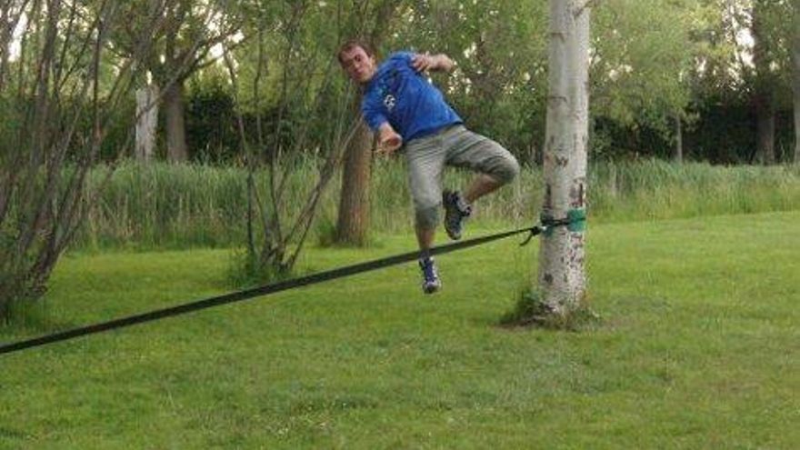 Diego Franco, de Santa María, se ocupa diariamente del montaje de estructuras metálicas pero, a pesar de la dedicación a su trabajo, este joven leonés de 23 años esconde una gran pasión: el slackline.