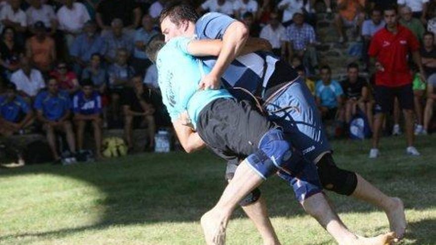 Héctor García, 'el divino' de Campohermoso, y Moisés Vega. Primero contra segundo de la Liga de Verano en categoría de peso medio. Sobre la hierba, descalzos, como manda la tradición, entran juntos. Se sujetan el cinto, de cuero, piel de vaca. Ante la atenta y fija mirada de los árbitros se agarran preparados para el baile y colocan sus pulgares lejos de la hebilla. Mano derecha atrás, a la espalda. Mano izquierda en el abdomen del contrario. Suena el silbato y comienza la lucha. Tres minutos intensos, llenos de clase, maña, fuerza y elitismo. Conceptos que definen este deporte autóctono convertido en arte en la montaña leonesa y en la ribera, al norte de la capital. No falta la afición. Un millar de personas se da cita en el coso riañés.