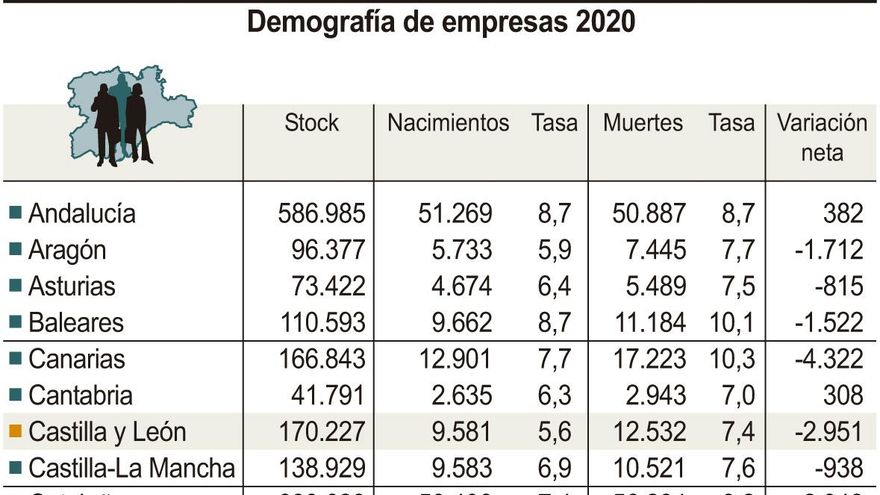 La Demografía armonizada de empresas del Instituto Nacional de Estadística (INE) indica que la tasa de nacimientos de empresas en la Comunidad, se situó en 2020, en el 5,6 por ciento, lo que supone la más baja del conjunto de España, por delante de La Rioja (5,7) y Aragón (5,9) y alejada del 7,5 por ciento de la media para el conjunto de las autonomías.