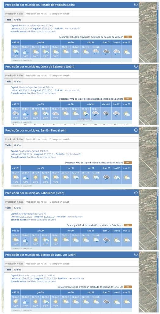 El modelo de Aemet señala para lo que queda de este miércoles y jueves una cota provincial para nieve desde 600 metros cuando se buscan varios municipios como Oseja de Sajambre, San Emiliano, Posada de Valdeón o Cabrillanes. Y todo pese a que considera, en otro lugar de su web de predicción, que tendremos “Temperaturas en ligero ascenso o sin cambios” para este jueves. En Oseja asegura que habrá precipitación esta noche al 80% y que será de nieve al estar la cota en 600 metros con una mínima de 13 grados.