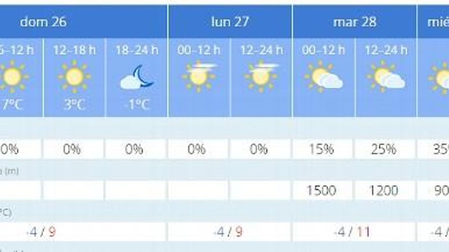 Este noviembre no ha sido así pero parece que al final llegará este panorama, que comienza este mismo domingo 26 de noviembre con al menos dos días de alerta oficial declarada por la Agencia Estatal de Meteorología (Aemet) al preverse desde esta próxima madrugada temperaturas que bajarán hasta los -4 grados centígrados. Una temperatura mínima que según la misma agencia se repetirá todas las noches de la próxima semana, estabilizando así el frío. Mientras, las máximas oscilarán entre los 11 el momento más caluroso y los 7 el máximo más frío.