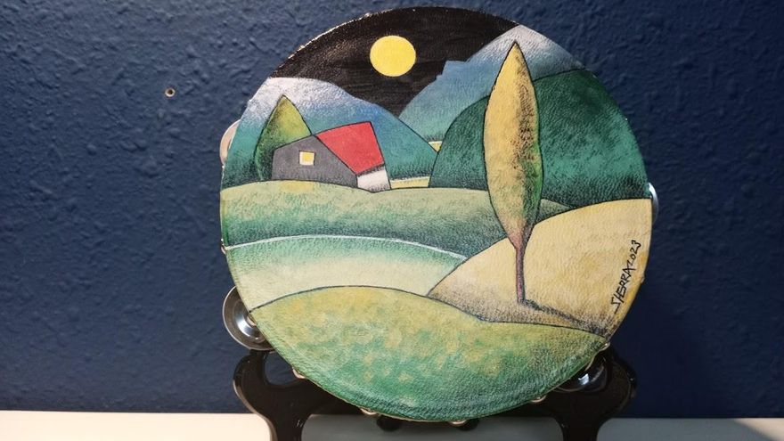 Sobre las 15 panderetas, el artista ha pintado paisajes y bodegones interiores. Sin faltar entre ellos las imágenes ya icónicas de este babiano – lacianiego, como lo son, su pájaro republicano, las montañas, la flor de la grichándana o su carro rojo.