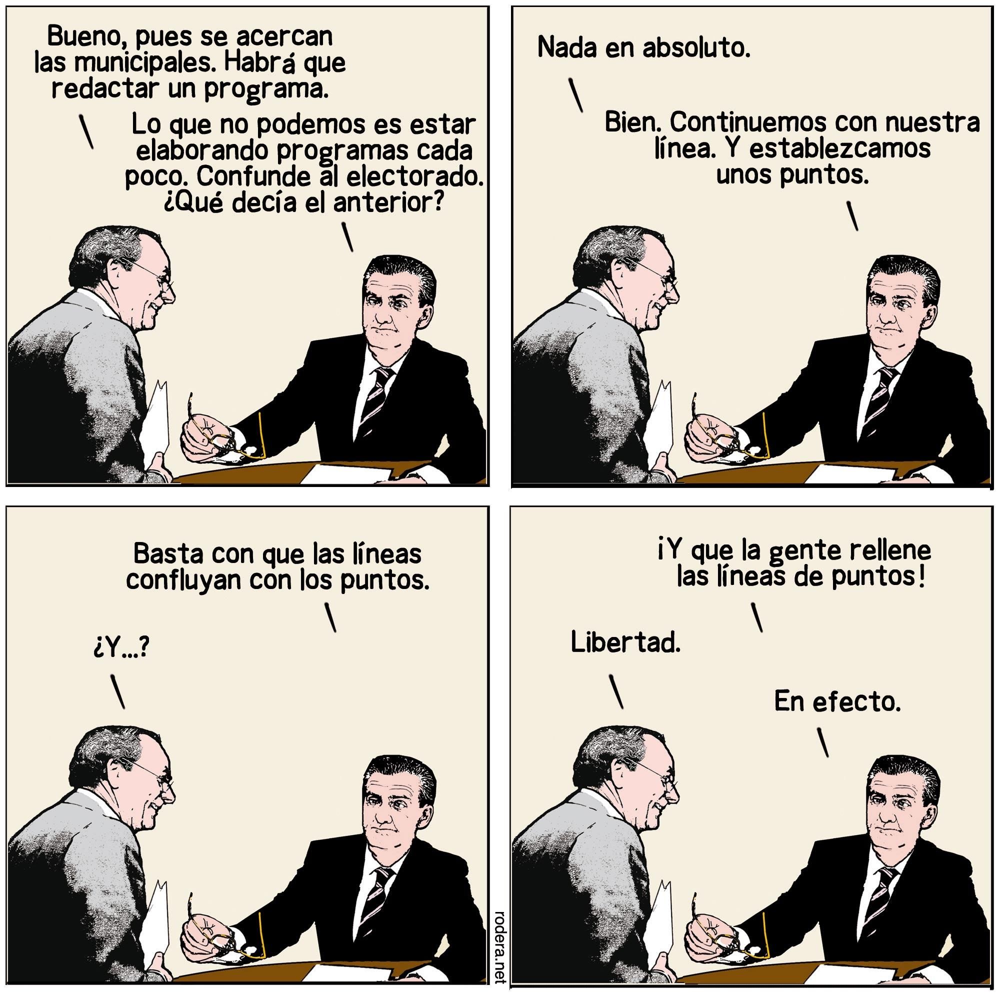 Cuando estrenaron la película de Guillermo del Toro La forma del agua yo contestaba siempre: ¡la del recipiente! Nadie me preguntaba, pero tenía razón. El agua se adapta a la vasija que la contenga. En los formatos digitales se exige, como en las operaciones de las empresas después de salir a bolsa (es curioso que no antes), cierta liquidez. Es decir, que el formato se adapte a las diferentes pantallas variando sus dimensiones sin que su proporción se deforme. Arriba. Abajo. A los lados. ¡Hop! Este razonamiento tiene que ver con que la viñeta de arriba sea cuadrada e invulnerable. Hace tiempo los programas y promesas electorales se creaban, ampliaban o monstruizaban para un público más o menos crédulo (palabra que prefiero a creyente y que considero sinónimo) según las expectativas. Esto ha cambiado. Ahora es la persona que vota la que, tranquila, elegante, displicente y diagonal desparrama su papeleta en la urna o pecera con la seguridad de que su receptor le dará el uso, reducido e incluso inexistente, que crea apropiado. ¿Para qué pensar o elegir? Discurre como el agua. Tu cauce sabrá. Be water. Hasta el colector.