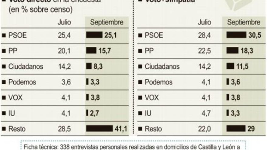 En ese sentido, en voto y simpatía, el PSOE lograría un respaldo en Castilla y León del 30,5 por ciento, lo que supone una subida de dos puntos respecto al estudio anterior del CIS, correspondiente al mes de julio, cuando la encuesta le otorgaba el 28,4 por ciento. En el caso del PP, el informe indica una pérdida de apoyos en la Comunidad, al pasar del 22,5 por ciento, al 18,3 por ciento.