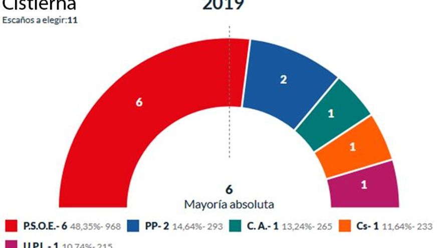 El PSOE gana en Cistierna las elecciones municipales este 26 de mayo con 6 concejales y el 48,35% del voto y logra la mayoría absoluta con lo que repite en la Alcaldía el socialista Nicanor Sen. Por su parte, el PP se sitúa en segundo lugar con dos ediles y el 14,64% , mientras que Cistierna Activa, UPL y Ciudadanos obtienen uno cada uno, con el 100% escrutado.