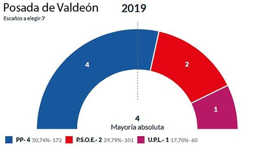 En el municipio de Posada de Valdeón el Partido Popular ha vuelto a lograr la mayoría absoluta al lograr 4 de los 7 concejales con 172 votos (50,74%) frente a los 101 de la candidatura del PSOE (29,79%) que se queda en 2 concejales y UPL logra un concejal con 60 votos (17,70%). Tomás Alonso, alcalde desde 2011, seguirá siendo el regidor del municipio un mandato más.