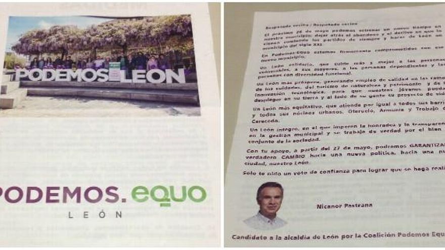 - Nota al margen: el diseño de la campaña de Podemos no se merece un suspenso sino una nota de bien (quizás un poco bajo porque no ha llegado a esta Redacción casi nada); pero un folleto de programa municipal de esas características es un desastre. Sobre todo porque si está entre muchos papeles del buzón uno no se daría ni cuenta de qué están vendiendo; y menos de que es propaganda electoral (lo cual es nefasto para una campaña electoral). Pero es que es abrirlo y que a uno se le quiten las ganas de leer ese tocho. Lastra el esfuerzo notable del programa amplio que llegó (eso sí, esta semana) por Telegram, bien facturado y maquetado. Tanto que se carga la imagen política de Podemos en el Ayuntamiento. Lo único, quizás, es que oculta al candidato para no perder votos. Y eso explica el suspenso —posiblemente injusto para los que sí se lo han currado aprendiendo del desastre de 2015—, que repite como formación política municipal 'heredera' de León Despierta.