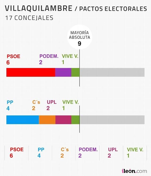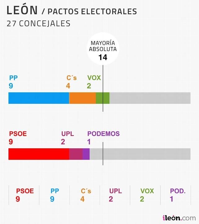 La mayoría absoluta del municipio del alfoz de León se sitúa en los nueve concejales por lo que será obligatorio un tripartito para conformar un gobierno estable. La UPL de García Bayón ya demostró que puede gobernar a derecha e izquierda el pasado mandato, cuando formó gobierno con el PP pero luego votó la moción de censura y lo hizo con el PSOE sin el menor problema práctico. Podemos ha formado parte también del actual gobierno salido de la moción de censura con PSOE y UPL. Si los tres repiten acuerdo tendrían una mayoría holgada de 10 concejales.