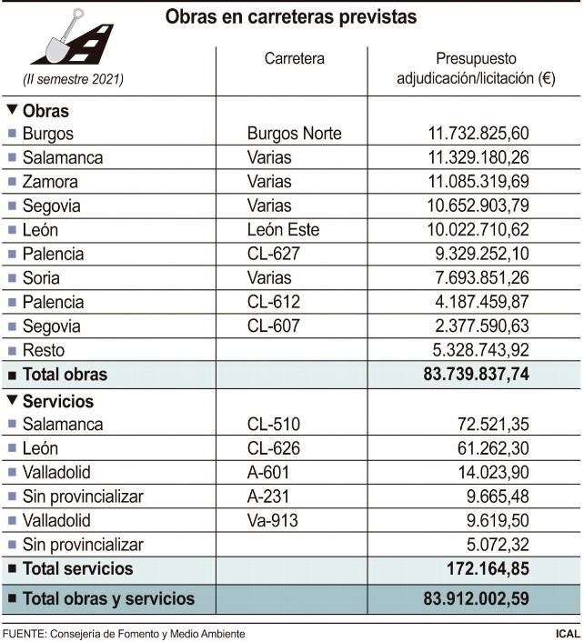 Las carreteras recobran el protagonismo inversor del pasado en Castilla y León. La Consejería de Fomento y Medio Ambiente prevé movilizar hasta final de año casi 84 millones de euros en obras y servicios para mejorar la conservación y el mantenimiento de la red viaria de la Comunidad. Este paquete se suma a los 42,5 millones que sacó a concurso durante el primer semestre de este 2021, ejercicio en el que la Junta estrenó nuevos presupuestos.