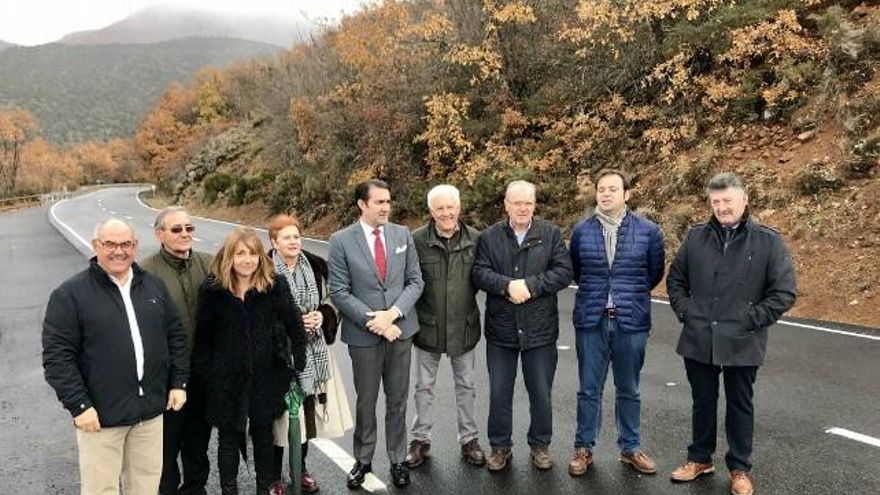 El consejero, alcaldes y representantes de la comarca en un punto de la carretera arreglada este año en Luna.