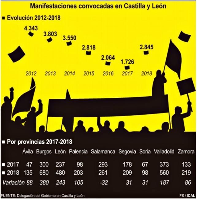 En todas la provincias se registraron incrementos a excepción de Salamanca, donde se registró una caída del 10,9 por ciento al contabilizar 261 protestas, 32 menos que en el 2017. Soria, con 98 concentraciones, un 46,3 por ciento más, ocupó la ultima posición. En Zamora se contabilizaron 219 (+64,7 por ciento); en Segovia, 209 (+17,4 por ciento) y en Palencia, donde se duplicaron, 203.