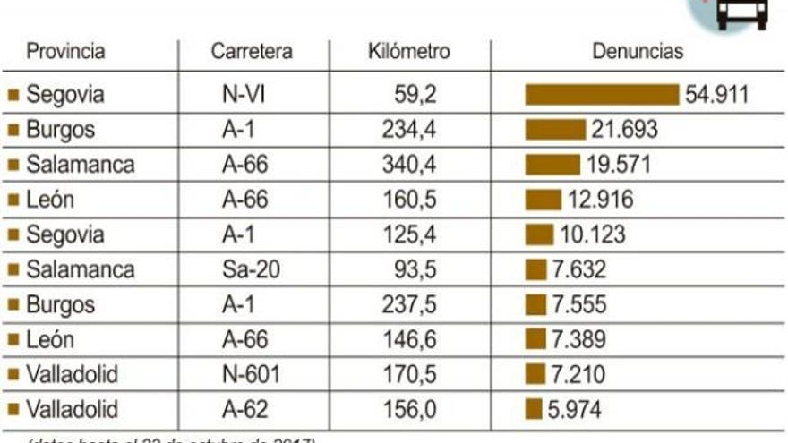 La lista de los diez radares más sancionadores de Castilla y León se completa con los ubicados en el punto kilométrico 160,5 de la A-66 (León); en el 125,4 de la A-1 (Segovia); en el 93,5 de la SA-20 (Salamanca); en el 237,5 de la A-1 (Burgos), y en el 146,6 de la A-66 (León). Los dos últimos se encuentran en la provincia de Valladolid, en la N-601 (punto 170,5) y en la A-62 (156).