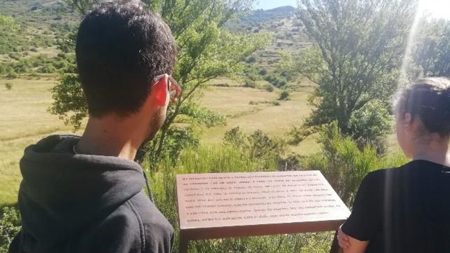 Uno de los placeres especiales de esta senda es la literatura. Literalmente. Cada ciertos tramos asalta al senderista un hito metálico bien visible que relata la historia del Celorio, el personaje local no se sabe si real o ficticio pero tan entrañable como dura y azarosa fue su vida rural en los albores del siglo XX y hasta la Guerra Civil, donde a la tragedia de sus daños de nacimiento se unió la de la violencia fratricida.