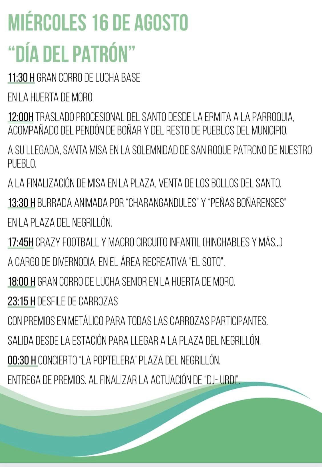 El miércoles 16 de agosto, que es el día propio del patrón San Roque, será el momento de la tradicional procesión, dos corros de lucha leonesa, la competición de la burrada por la Plaza del Negrillón, juegos para los niños y el desfile de carrozas como más destacado durante el día. Y ya llegada la noche, será el mencionado concierto de La Poptelera, seguido de la fiesta musical con Dj.