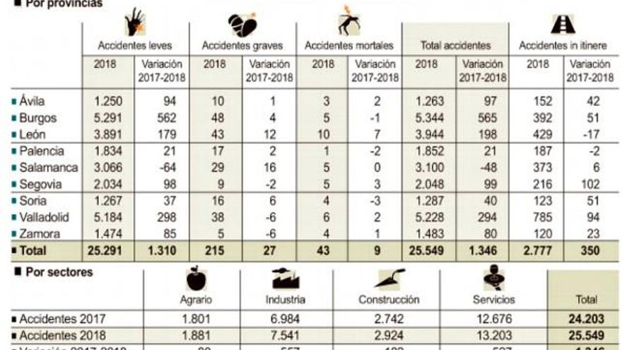 Las cifras globales de siniestralidad, recogidas por Ical, revelan que a lo largo del año pasado, se contabilizaron en las empresas de Castilla y León, un total de 25.549 accidentes con baja, lo que supone un aumento del 5,5 por ciento respecto a lo de 2017, con 1.346 siniestros más. Las frías estadísticas revelaron 215 siniestros graves, 27 más que el año anterior, con un avance del 14,3 por ciento. Los accidentes leves ascendieron a 25.291, un 5,4 por ciento más.
